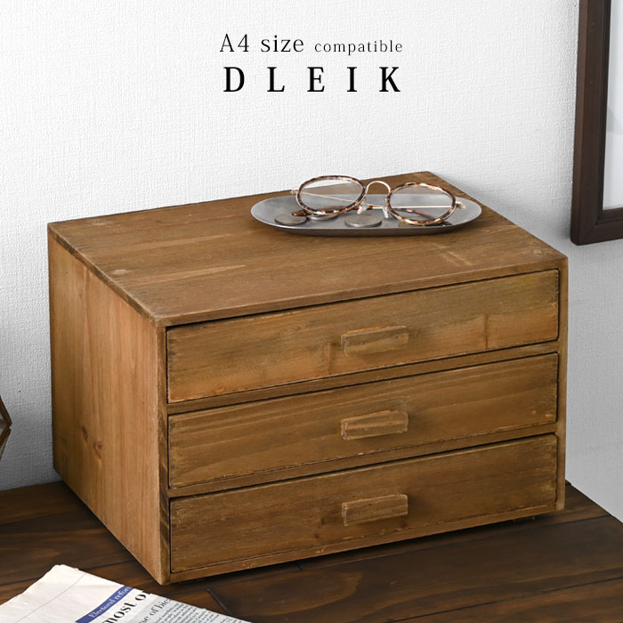 商品について 机まわりがすっきり整う便利サイズの卓上チェスト「DLEIK(ドレイク)」。こまごましたものやアクセサリー、散らかりがちな書類など、あらゆるものを整理整頓。デスク上にあると嬉しい収納グッズ。天然木にあえてヴィンテージ加工を施し、味わい深く それでいて温かみある仕上がりになっています。棚の内寸は幅30×奥行21.5cmと文具や小物の収納にちょうどいいサイズです。3段の棚があるので、書類ごとに分けて収納できるのも嬉しいポイントです。引手は指で持ちやすいように少し奥が窪んだ形状。また引き出しはすべて出し切れるので、奥に紙などが挟まってもきちんと取り出せるんです。機能的でもあり、魅力がいっぱい詰まったアイテムですよ。※注意・天然木特有の色みのむら、ささくれがございます。・ハンドメイド商品のため、多少の個体差があります。上記、天然木・ハンドメイドの味わいとしてあらかじめご了承いただきますようお願い致します。 商品名卓上 ミニチェスト ドレイク 商品仕様ウッド 商品サイズ(約)幅33cm×奥行き24.5cm×高さ21cm 商品重量(約)1.6kg 梱包サイズ(約)幅34cm×奥行き25cm×高さ22.5cm 梱包重量(約)2kg 梱包数1個口 生産国中国 組み立て完成品 注意事項