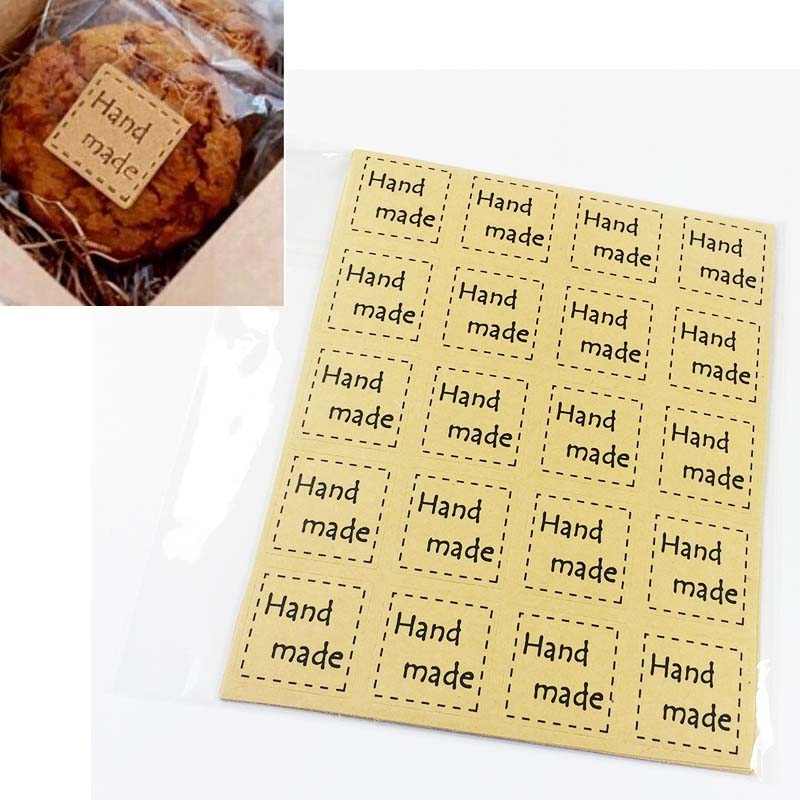 1シート、20個の英語でハンドメイド(Hand made)と書かれたブラウンカラーのシール販売。自分で手作りした洋服や手編みのセーター、マフラー、ケーキ、パン、アクセサリー、ピアス、イヤリングなどをプレゼントするときに袋や箱に貼るだけで手作り感をアップできるシール。もちろん、自分で作ったものじゃなく、買ってきた既製品にでも、このシールを貼ると。あ〜ら不思議、手作りに見えちゃう魔法のステッカー(笑)。いい子はそんなことしちゃダメですよ。 プレゼントギフトするときには最適のステッカーです。 スペック1シートの大きさ:約13.5mmx10mm1マスのシールの大きさ:23mmx23mm素材紙備考・表示は1シートの価格です。・ハンドメイドの為多少サイズは異なります。