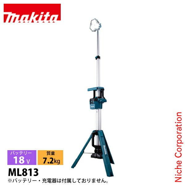 マキタ(makita) 18V/14.4V 充電式タワーライト 本体のみ[ML813]▼最大高さ2m24cm、素早く上から照らす三脚一体型■特長●最大高さ2m24cm作業のしやすい上部から素早く照射。最小高さは1m25cm。無段階で高さ調整可能。ML814はライトヘッドの向きを変えることでエリア照射にも対応。●狙って照らすスポット照射高所作業時もより近くからの照射で手元が見易くなり、作業性が向上。●照射位置を自在に調整 左右は230゜まで回転 上下に220゜回転●収納はコンパクト、全高1m三脚一体型、キャリーハンドル付で持ち運びに便利。●セッテイングはスピーディ取手部のスイッチでロック解除。スライドさせれば三脚部オープン。●伸縮パイプで高さを調整ラッチで高さを固定。●1充電あたりの連続点灯時間(BL1860B使用時/目安)約12時間(弱モード)約4時間(強モード)●バッテリ切れお知らせ容量が少なくなると全点灯から1箇所点灯でお知らせ。●バッテリ盗難防止用キーロック取付け穴付鍵は市販品をご利用ください●三脚固定用穴付(転倒防止)ペグなどで固定する際に便利。●粉じんや雨から保護、防じん・防水保護等級IP55※※粉じんや水による影響を受けにくいように設計されていますが、故障しないことを保証するものではありません。●専用ツールバッグ付ショルダベルトは取り外して本機に取り付け可能。 ■仕様【モデルNo】ML813【光源】LED:12灯【照度】 強:1,250 lx 中:750 lx 弱:400 lx※ルクスは光源より先方1m。【光束】 強:3,000 lm 中:1,700 lm 弱:900 lm【電源】直流14.4 V /18 V※ライトバッテリ除く。【1充電連続使用時間(目安) 】 18V <BL1860B-6.0Ah> 強:約4時間 中:約7時間 弱:約12時間 <BL1830B-3.0Ah> 強:約1時間54分 中:約3時間 弱:約5時間30分 14.4V <BL1460B-6.0Ah> 強:約2時間30分 中:約4時間 弱:約8時間 <BL1430B-3.0Ah> 強:約1時間18分 中:約2時間 弱:約3時間30分※数値は参考値です。バッテリの充電状態や作業条件によって異なります。【本機寸法】 展開時:長さ573 mm×幅658 mm×高さ2,240 mm 収納時:長さ260 mm×幅216 mm×高さ1,000 mm【質量】7.2 kg ※バッテリ除く。【標準付属品】 ツールバッグ ショルダーベルト【機能】 防じん・防水:IP55【適応バッテリ】・18VリチウムイオンバッテリBL1860B、BL1850B、BL1850、BL1840、BL1830B、BL1830、BL1820B、BL1815N・14.4VリチウムイオンバッテリBL1460B、BL1450、BL1440、BL1430B、BL1415N※国内仕様のメーカー純正品です。並行輸入品・互換品・再生品ではございません。※安全に商品をご使用いただくために、マキタ製充電式製品には、マキタ純正のバッテリー・充電器をご使用いただきますようお願いします。なお、当店では模倣品、互換品のバッテリー・電池パック、リサイクル修理されたバッテリー・電池パックのご使用に起因する事故・故障につきましては、一切の責任を負いかねますのでなにとぞご了承ください。【kk9n0d18p】[ マキタ MAKITA 正規販売店 DIY 充電式 電動 バッテリー式 コードレス コンパクト 防水 防塵 防じん ]2025/02/03