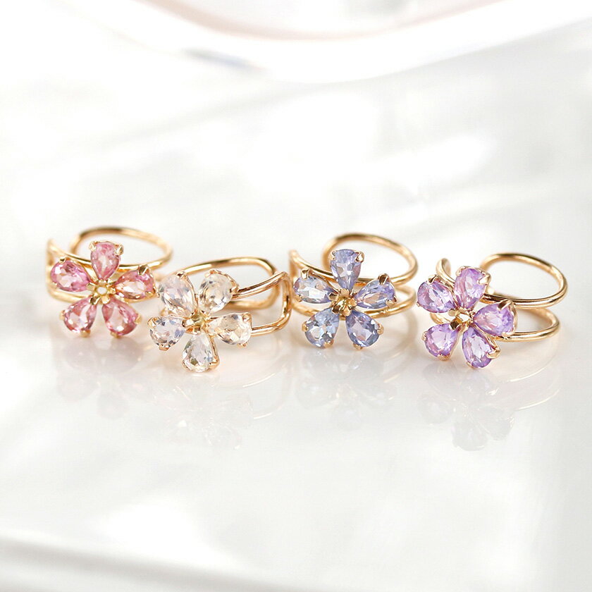 石 ピンクトルマリン/アメジスト/シトリン/ブルームーンストーン/ローズクォーツ/タンザナイト/マルチカラー(シトリン/ ブルートパーズ/ ピンクトルマリン/ タンザナイト/ ペリドット) 材質 K10ゴールド 大きさ モチーフ:6×6mm カラーストーン:3×2mm フープ内径:直径8mm 品番 PA334390-3/436-8 お届けする商品について 商品写真はできる限り実物の色に近づくよう補正調整を施しておりますが、デバイスや照明等の環境により、実物とお色味が異なる場合がございます。宝石にはそれぞれ個性があり、お色味の濃淡や多少の傷や内包物がございます。また、ひとつひとつハンドメイドで仕上げているため、お色味や形状などが写真とは、また左右で若干異なる場合もございます。(大変申し訳ございませんが、個別でのご指定はいただけません。ご了承くださいませ。) お届けする商品について * 宝石にはひとつひとつに色味のちがいや濃淡があるため、 またひとつひとつハンドメイドで仕上げているため、 色味、形状などが写真とは、また左右で若干異なる場合もございます。 (色味について個別でのご指定はいただけません。)耳元に咲く、一輪の花 【片耳】7カラーストーン×K10イエローゴールドイヤーカフ・エクラントフラワー 5つのペアシェイプを合わせて、シンプルなお花のイヤーカフをおつくりしました。フラワーモチーフって可愛らしくなりすぎて、普段つけるのはちょっと・・とコーディネートに合わせづらいものもありますよね!「さりげなく、愛らしい」そんなピアスを目指して、サイズやカラーストーンのバリエーションにこだわって仕上げました。 思わず手をふれたくなるようなシルエット シンプルなフラワーモチーフを、耳の中央につけて楽しむイヤーカフ。「ピアスホールはあいていないけれど、耳元のおしゃれは楽しみたい」という方にぴったり!圧迫感が少なく、イヤリングよりも痛くなりにくい今注目のアイテムです。 ふんわりと広げた5枚の花びらは、ピンクトルマリン、アメジスト、シトリン、ブルームーンストーン、ローズクォーツ、タンザナイト、マルチカラーの合計7種類ご用意しました!ありそうでなかった、余計な装飾を省いたとてもシンプルなシルエット・・可憐な姿はまるで本物のお花のよう。パステルカラーのカラーストーンでそろえたので、繊細な輝きを放ちます。 【コーディネートアイテム】 >>蝶々イヤーカフ・パルフィーヌ >>花イヤーカフ・エクラントフラワー >>花のイヤーカフ(ピアス)・シアロ 重ねて、組み合わせて。アレンジを楽しむイヤーカフ 大人にもつけやすい、主張しすぎないなフラワーモチーフ。耳の真ん中や上部につけて、さりげなく可愛らしい印象に。単体でつけるのはもちろん、ぜひ他のアイテムと組み合わせてつけるのがおすすめ!同系色の花のピアスや、蝶々モチーフ、リーフモチーフなどと合わせれば、耳元がたちまち華やかな印象に。あえてもう片耳はシンプルにまとめると、全体のバランスがとれますよ♪ 石 ピンクトルマリン/アメジスト/シトリン/ブルームーンストーン/ローズクォーツ/タンザナイト/マルチカラー(シトリン/ ブルートパーズ/ ピンクトルマリン/ タンザナイト/ ペリドット) 材質 K10ゴールド 大きさ モチーフ:6×6mm カラーストーン:3×2mm フープ内径:直径8mm 品番 PA334390-3/436-8 シリーズ >>通常ピアスはこちら♪ >>セカンドピアスはこちら♪ お届けする商品について 商品写真はできる限り実物の色に近づくよう補正調整を施しておりますが、デバイスや照明等の環境により、実物とお色味が異なる場合がございます。宝石にはそれぞれ個性があり、お色味の濃淡や多少の傷や内包物がございます。また、ひとつひとつハンドメイドで仕上げているため、お色味や形状などが写真とは、また左右で若干異なる場合もございます。(大変申し訳ございませんが、個別でのご指定はいただけません。ご了承くださいませ。) フラワージュエリーコレクション 桜やキンモクセイ、バラ、すずらん・・カフェオリがお届けするフラワージュエリーをご紹介します。 >>コレクションを見る♪