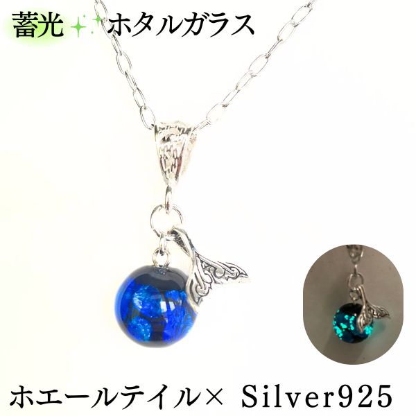 蓄光 ホタルガラス ホエール ドルフィンテイル silver925 刻印入り 国産 チョーカー イルカ くじら 尾 オーシャンブルー ホタル石 沖縄 琉球 グラス 光る アレルギーの方に優しい 美しい 綺麗 大人 ひかる