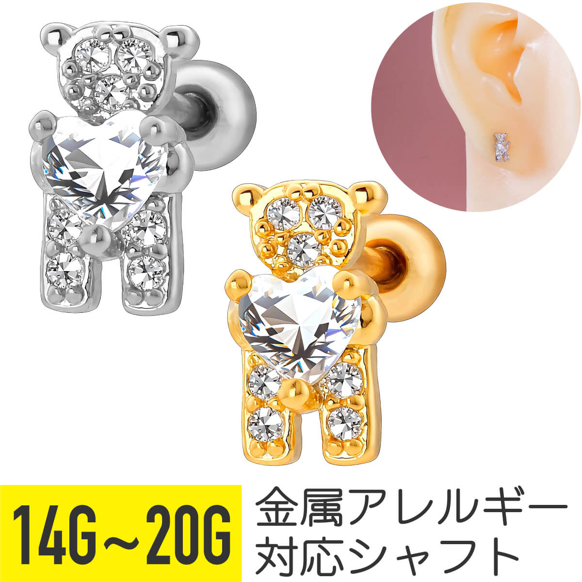 ハート ジュエル ベア ストレートバーベル 14G 16G 18G 20G サージカルステンレス ジルコニア ジュエル シルバー ゴールド イヤーロブ ヘリックス トラガス アウターコンク 軟骨ピアス ボディピアス テディベア クマ くま 熊 動物 アニマル 金属アレルギー対応