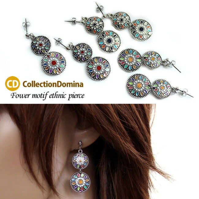 ピアス レディース エスニック風 ラウンド お花 フラワー ロング 丸型 ぶらさがり 揺れる かわいい お洒落 上品 可愛いピアス かわいいピアス レディースピアス シンプルピアス チタンポスト マルチカラー カラフル 混色