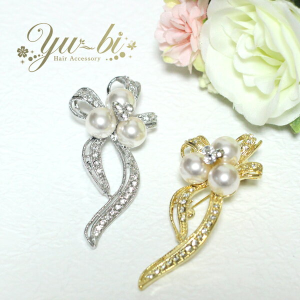 【ゆうパケット送料無料】ブローチ/華やか 流れリボン きらきらラインストーン 大粒パール br68/ゴールド/シルバー ブローチピン ビジュー 曲線 エレガント 結婚式 卒業式 入学式 入園式 卒園式 パーティー アクセサリー ピンブローチ フォーマル セレモニー【あす楽対応】