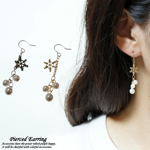 \半額★50%OFF/レディースピアス 雪の結晶 スノーフレーク プラスチックパール 人工真珠 3連 キラキラ きらきら ゴールド シルバー サージカルステンレスフック フックピアス フック(チタン/樹脂)orイヤリングへの変更OK 金属アレルギー対応