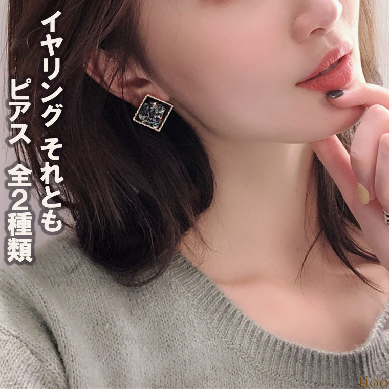【シェル・スクエア】【ラメストーン 四角 ビジュー ホワイトブラック レインボー】きらきらピアス レディース イヤリング サークル 飴玉 おしゃれ かわいい 可愛い セット シンプル カラフル 丸 合金 メッキ 春 夏 秋 冬