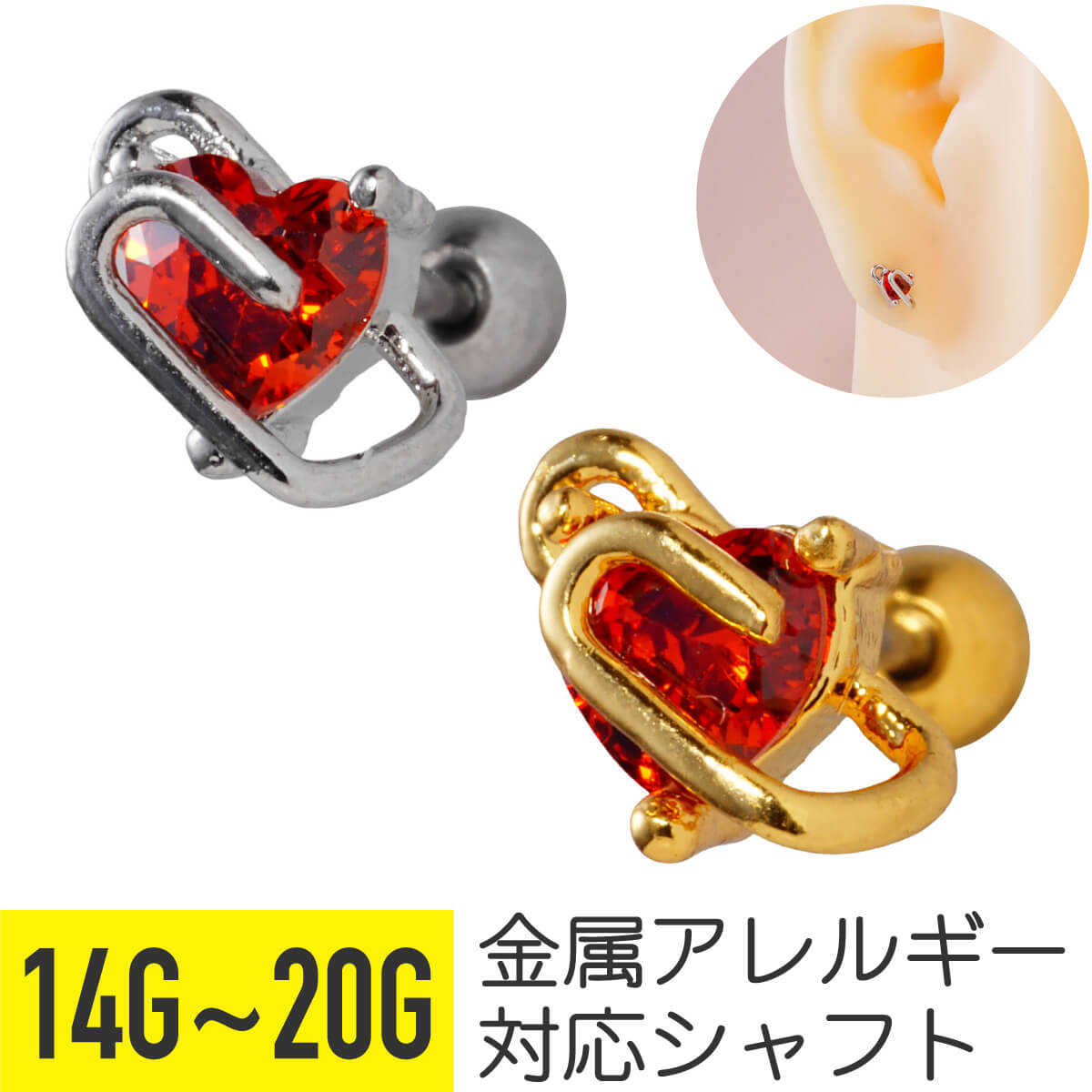 クリップ レッド ハート ジュエル ストレートバーベル 14G 16G 18G 20G サージカルステンレス ジルコニア シルバー ゴールド ヘリックス トラガス アウターコンク 軟骨ピアス ボディピアス ゼムクリップ 文房具 ステーショナリー 赤 cz キラキラ 金属アレルギー対応