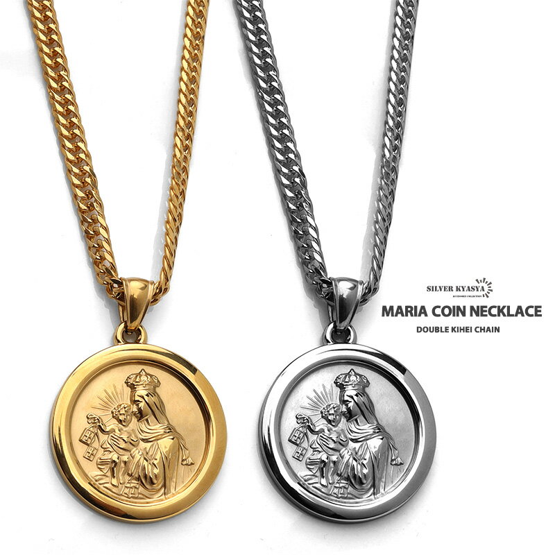 ステンレス素材 6面カット ダブル喜平ネックレス 18k gp 奇跡のメダイ ネックレス ゴールド 18金 仕上げ シルバー 聖母 メダイ ペンダント メンズ HIPHOP b系