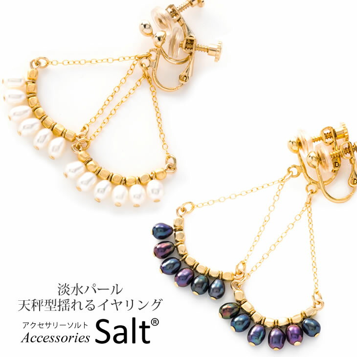 揺れるピアス商品名アクセサリーSalt 淡水パール天秤型揺れるイヤリング イヤリング金具真鍮+22Kメッキ(ニッケルフリー) 耳が痛くなりにくいイヤリングカバー付チャーム淡水パール 大きさ(1粒):縦約5mm×横約3mm マットゴールドビーズ 素材:真鍮(マットゴールドコーティング) 大きさ: 1粒直径 約2mm チェーン素材:K14GFご注文前にご一読ください。お取り扱いのご注意 アクセサリーは1つ1つハンドメイドで製作されている為繊細に出来ております。 乱暴に扱うとテグスやワイヤーが切れたり、素材やパーツにが傷ついてしまいますのでお気をつけください。 また水や汗、皮脂の付着により金属素材が変色することがございます。ご使用後は柔らかい布などで拭いてお手入れをされることをお勧めいたします。 【イヤリング 揺れる】【イヤリング 痛くない】【アクセサリーソルト】