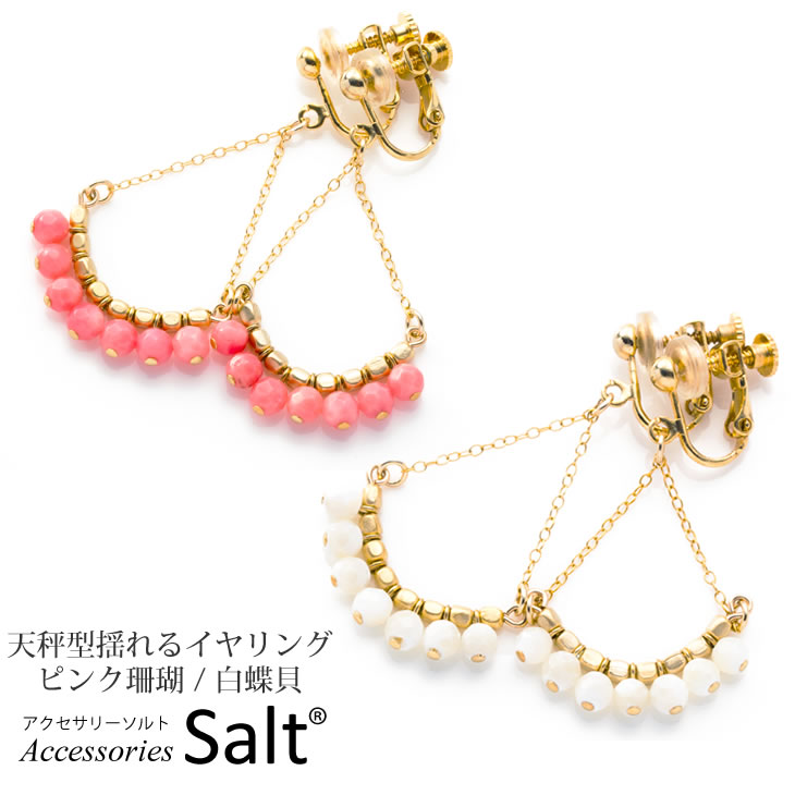 揺れる イヤリング商品名 バランススケール 天秤型 揺れるイヤリング イヤリング金具イヤリング金具 真鍮+22Kメッキ(ニッケルフリー) 耳が痛くなりにくいシリコンカバー付 チャーム部分天然石 白蝶貝(マザーオブパール):1粒約3mm×7粒 ピンク珊瑚:1粒約3mm×7粒 マットゴールドビーズ 素材:真鍮 直径:約2mm チェーン 素材:K14GF(ゴールドフィルド) 長さ:約22mmご注文前にご一読ください。K14 ゴールドフィルドについて(K14GF) K14 gfは金の層を高熱と圧力で真鍮に圧着したもので、その金(10K 以上)の層の重量が素材を含む総重量の1/20以上あるものをいい、欧米では大変ポピュラーな素材です。当ショップで使用しているものは、金メッキと異なりとても厚いK14(14金)の層になっており、長期間使用しても剥げにくいためアレルギーになりにくい素材としても優秀です。(全ての人にアレルギー反応がないわけではありません。)色もシャンパンゴールドのような輝きで大変高級感があります。 お取り扱いのご注意アクセサリーは1つ1つハンドメイドで製作されている為繊細に出来ております。 乱暴に扱うとテグスやワイヤーが切れたり、素材やパーツにが傷ついてしまいますのでお気をつけください。 また水や汗、皮脂の付着により金属素材が変色することがございます。ご使用後は柔らかい布などで拭いてお手入れをされることをお勧めいたします。 【揺れるイヤリング】【イヤリング 痛くない】【ゆれる イヤリング】【アクセサリーソルト】