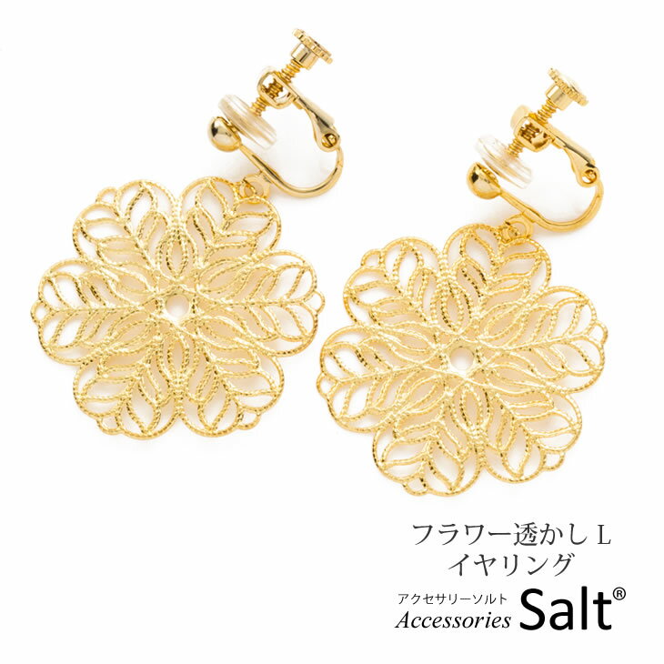 フラワー(お花)透かしイヤリング商品名フラワー透かしLサイズ イヤリングチャームフラワー透かしモチーフ直径:約28mm 真鍮+メッキイヤリング真鍮+22Kメッキ(ニッケルフリー) 耳が痛くなりにくいイヤリングカバー付ご注文前にご一読ください。お取り扱いのご注意アクセサリーは1つ1つハンドメイドで製作されている為繊細に出来ております。 乱暴に扱うとテグスやワイヤーが切れたり、素材やパーツにが傷ついてしまいますのでお気をつけください。 また水や汗、皮脂の付着により金属素材が変色することがございます。ご使用後は柔らかい布などで拭いてお手入れをされることをお勧めいたします。 【お花 イヤリング】【金属アレルギー イヤリング】【透かし イヤリング】 【金属アレルギー対応】【アクセサリーソルト】
