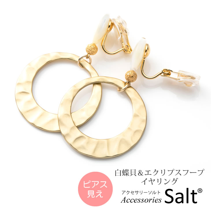 ピアス見えイヤリング商品名アクセサリーSalt エクリプス&白蝶貝シェル ピアス見え イヤリング チャーム 白蝶貝 大きさ:直径約12mm ※天然素材のため色・形に若干個体差がございます。 エクリプスフープ 大きさ:直径約30mm 素材:亜鉛合金+マットゴールドメッキ イヤリング クリップ 素材:真鍮+メッキ 耳が痛くなりにくいシリコンカバー付き 対象 レディース 女性 ママ お母さん 娘 妻 彼女 20代 30代 40代 50代 アラサー アラフォー 女友達 ママ友 シーン・用途 結婚式 二次会 パーティー オフィス 仕事 通勤 カジュアル 誕生日 記念日 ギフト プレゼント 母の日 ホワイトデー クリスマス テレワーク バーチャル飲み会 リモート飲み会 オンライン おしゃれ 卒業式 入学式 卒園式 入園式 お出かけ 女子会 誕生日プレゼント 結婚記念日 ご注文前にご一読ください。お取り扱いのご注意アクセサリーは1つ1つハンドメイドで製作されている為繊細に出来ております。 乱暴に扱うとテグスやワイヤーが切れたり、素材やパーツにが傷ついてしまいますのでお気をつけください。 また水や汗、皮脂の付着により金属素材が変色することがございます。ご使用後は柔らかい布などで拭いてお手入れをされることをお勧めいたします。 アフターケアについて 初期不良の場合は商品到着後7日以内にご連絡下さい。無料で修理させていただきます。(送料は当店負担) アクセサリーソルト