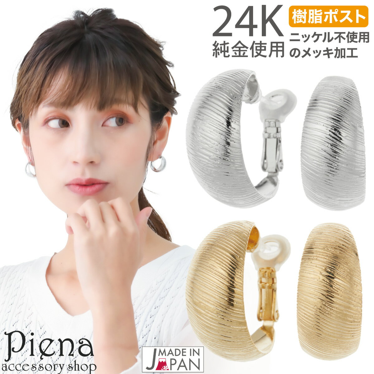 ギフト対応 素材 真鍮製 パーフェクトコーティング K24金コーティング 本ロジウムコーティング ポリカーボネート樹脂 サイズ 縦:約27.0mm 横:約27.0mm 厚み:約2.0mm 正面から見た時の幅:約2.0mm ポスト長さ:約9.0mm ポスト太さ:約0.9mm 丁寧な作りがご好評頂いております。メイドインジャパン。 国産、日本製アクセサリーです。 女性らしい凛とした印象を与えてくれるフープピアスです。 ポスト部分にはお肌に優しいポリカーボ樹脂を使用しています。 ひねりを加えた滑らかなウェーブラインが、 シンプルながらもこなれた印象をプラスするデザインです。 艶やかな光沢がお顔まわりを華やかに飾り、 上品な艶めきが大人の雰囲気漂うアイテムです。 メッキ部分が耳に直接触れないように、 ピアスモチーフとポストの間に入れるカバーが付いています。 受け穴部分が可動して容易な脱着ができるのも嬉しいポイントです。 記念日、自分へのご褒美、プレゼント、クリスマス、 ホワイトデー、誕生日など、様々なイベントの 贈り物にぴったりのカジュアルジュエリーです。 ポスト部分にはポリカーボネート樹脂を使用しているので、 金属アレルギーの人にも安心、安全な素材です。 (金属アレルギーの方は、樹脂を使用した部分以外がお体に触れないようご注意下さい) 類似商品はこちらフープピアス レディース 日本製 ねじり ひね1,698円フープピアス レディース 日本製 ひねり ツイ1,698円フープピアス レディース 日本製 甲丸 幅広 1,698円フープピアス レディース 日本製 ライン 模様1,698円フープピアス レディース 日本製 二連風 ダブ1,698円フープピアス レディース 日本製 ダイヤカット1,698円フープピアス レディース 日本製 逆甲丸 幅広1,698円フープピアス レディース 日本製 たたき加工 1,698円フープピアス レディース 日本製 甲丸 ツヤ 1,598円新着商品はこちら2025/11/20イヤリング レディース マグネットイヤリング 680円2025/11/19ピアス フープ つけっぱなし 樹脂 レディース348円2025/11/19ピアス レディース 両耳用 一粒パール 猫 猫680円再販商品はこちら2025/11/21ブレスレット レディース ラインストーン 9列1,198円2025/11/21ネックレス レディース サージカルステンレス製998円2025/11/21リング レディース シルバー925製 かえる 3,300円2025/11/21 更新