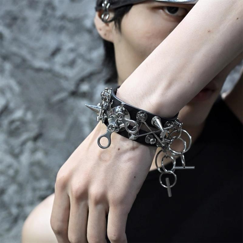 ブレスレット メンズ レディース ヘビーデューティー 不規則 メタル ラウンドバックル スタッズ チェーン パンク ゴシック ダーク ロック サブカルチャー ヒップホップ レザー 革 腕輪 ストリート 個性派 ファッション クール 存在感