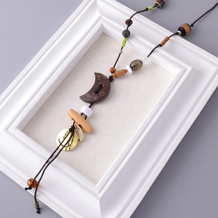 【P10倍クーポン】天然ウッド×ビーズ ロングネックレス ナチュラル 個性派 レディース 民族風 ボヘミアン スマイルチャーム付き おしゃれアクセサリー