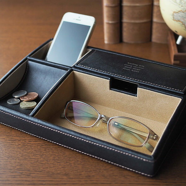商品情報名入れ右奥フタの天面中央約 25 x 25 mm 内にご希望のメッセージが入ります。文字のカラー : グレーサイズサイズ : 約 W250 x H55 x D170 mmボックス : 約 185 x 262 x 65 mm材質 材質 : 合成皮革 (PU), ポリエステルベルベットカラーブラック/ベージュ注意事項※ 価格には基本的なプリントが含まれております。※ イメージにはサンプルのメッセージが入っております。実際にはご希望のメッセージが入ります。商品説明携帯電話や時計、メガネ、鍵、小銭など普段使いの小物を一晩あずかってくれるのがオーバーナイター。毎日必要な物を機能的にまとめられる便利な収納トレーです。忙しい朝、昨日着た背広のポケットを慌てて探ることのないように、帰ったらポケットの中の小物はオーバーナイターに一晩預けましょう。選ばれる理由お財布やスマホ、キーケースをポケットに入れる男性には特にオススメしたいオーバーナイター。荷物を持つのが嫌いで、ズボンのポケットで済ませてしまう彼、かかってきた電話をすぐとれるように胸ポケットに携帯を入れるパパ。「いつもの置き場所」も専用トレーにすると、散らかった印象になりません。贈り物のアイデア●忘れ物が多いパパや彼へ贈るバレンタインギフト出掛けるたびに「アレ?! 何処に行ったんだろう?」なんて、自分で置いたはずなのに、置いたことすら忘れて、必要な時に困る...。そんなうっかり者のパパや彼へのバレンタインは、ポケットの物を整理して置いておける収納トレーがオススメです!●毎日同じスーツはいけません!スーツは1日着たら1日休みいくらスーツの所有数が少ないからと言って、毎日同じスーツはいけません。スーツを長持ちさせたいなら、1日着たスーツは1日以上ハンガーに吊して休ませてあげるのがポイント。それだけでもシワが取れて型崩れを防いでくれるので、ずいぶん見た目が変わります。●おかえりなさい!パパのスマホの指定席"おかえりなさい"、"おつかれさま"、"いつもありがとう"のメッセージが似合う父の日にプレゼント。パパの携帯や鍵、ポケットの中に入れる小物などを一晩預かってくれる忘れ物防止の指定席です。参考メッセージThe Best Dad AwardDear DadFrom Your Family202xベストファーザー賞パパへ家族より202x年Happy Valentine!Dear HarukiFrom Yukiハッピーバレンタイン!ハルキへユキよりWishing you every success!Dear KenjiFrom Kana成功を祈っているよ!ケンジへカナより 様々なシーンで活躍する名入れギフト【長寿祝い】還暦祝い(60歳)緑寿祝い(66歳)古希祝い(70歳)喜寿祝い(77歳)傘寿祝い(80歳)米寿祝い(88歳)卒寿祝い(90歳)白寿祝い(99歳)百寿祝い(100歳)【年間行事】七五三・成人祝い・バレンタインデー・ホワイトデー・クリスマス・卒業式・卒園式・退職祝い・入学式・入園式・母の日・父の日・お中元・敬老の日・お歳暮【結婚祝い】プロポーズ・婚約祝い・結婚祝い・両親へのご贈答・引出物・プチギフト・席札・ドラジェ・ウェルカムボード【出産祝い】子供のお祝い 出産祝い・内祝い・節句・入園祝い・入学祝い・卒園祝い・卒業祝い・就職祝い・進学祝い【結婚記念】銀婚式(25周年)真珠婚式(30周年)珊瑚婚式(35周年)ルビー婚式(40周年) サファイア婚式(45周年)金婚式(50周年)エメラルド婚式(55周年)ダイヤモンド婚式(60周年)プラチナ婚式(70周年)【会社・団体・法人関係】 栄転・昇進祝い・定年祝い・退職祝い・退職記念・歓迎会・送迎会・送別会・周年記念・記念品・ノベルティ・ギフト・粗品・イベント・創立記念・設立記念【スポーツ】 優勝・トロフィー・たて・盾・楯・ホールインワン・ゴルフ・表彰状・参加賞【その他】オリジナル商品・開店祝・オープン記念・法人成・ 落成式・退官祝い・地鎮祭・コンペ・周年記念名入れ オーバーナイター ブラック S 送料無料 小物 収納 ラッピング ギフトバッグ プレゼント 内祝い 誕生日 バレンタインデー 就職祝い 栄転記念 出張 父の日 男性 彼氏 誕生日 敬老の日 忙しい朝、昨日着た背広のポケットを慌てて探ることのないように、帰ったらポケットの中の小物はオーバーナイターに一晩預けましょう。 【忘れ物が多いパパや彼へ贈るプレゼント】 お財布やスマホ、キーケースをポケットに入れる男性には特にオススメしたいオーバーナイター。荷物を持つのが嫌いで、ズボンのポケットで済ませてしまう彼、かかってきた電話をすぐとれるように胸ポケットに携帯を入れるパパ。「いつもの置き場所」も専用トレーにすると、散らかった印象になりません。 お名前やメッセージ、ご希望のメッセージが入ります。 必要な物を機能的にまとめられる便利な収納トレー。 「いつもの置き場所」 ありがとう「感謝の気持ち」を伝えたい おめでとう「祝福の気持ち」を贈りたい 贈り物として信頼できる品をお探しの方に 【メッセージ・名前入りで世界にひとつのプレゼント】「このメッセージを伝えたい!」 「こうしようかな?どうしようかな?」色々考えて用意するメッセージ入りのプレゼント。どん