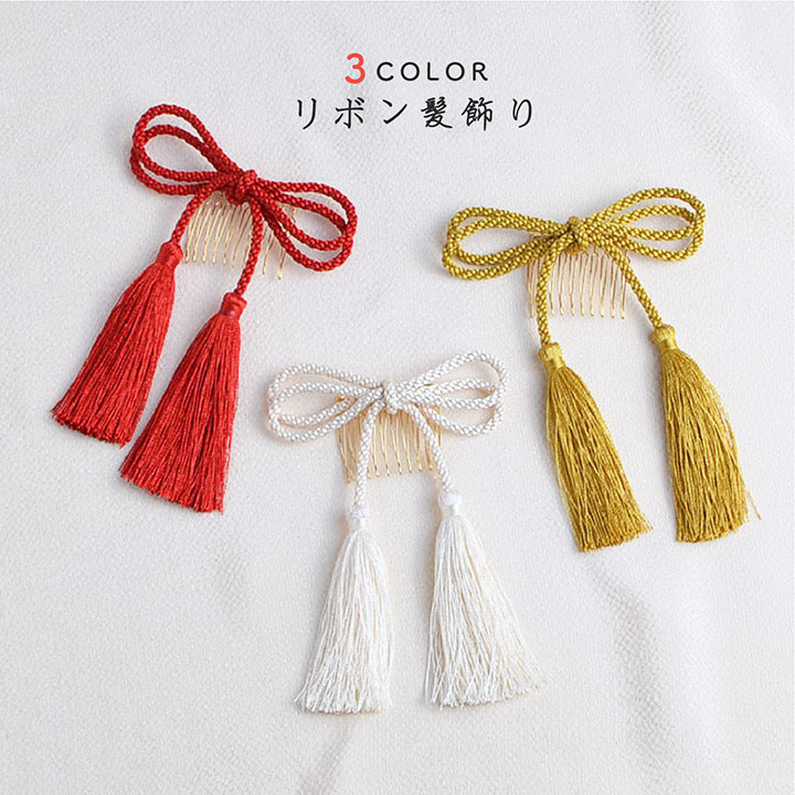 【即納】成人式・卒業式・結婚式 リボン髪飾り/組紐 タッセル【全3色】黄色 イエロー/白 ホワイト アイボリー/赤 レッド[wa087]
