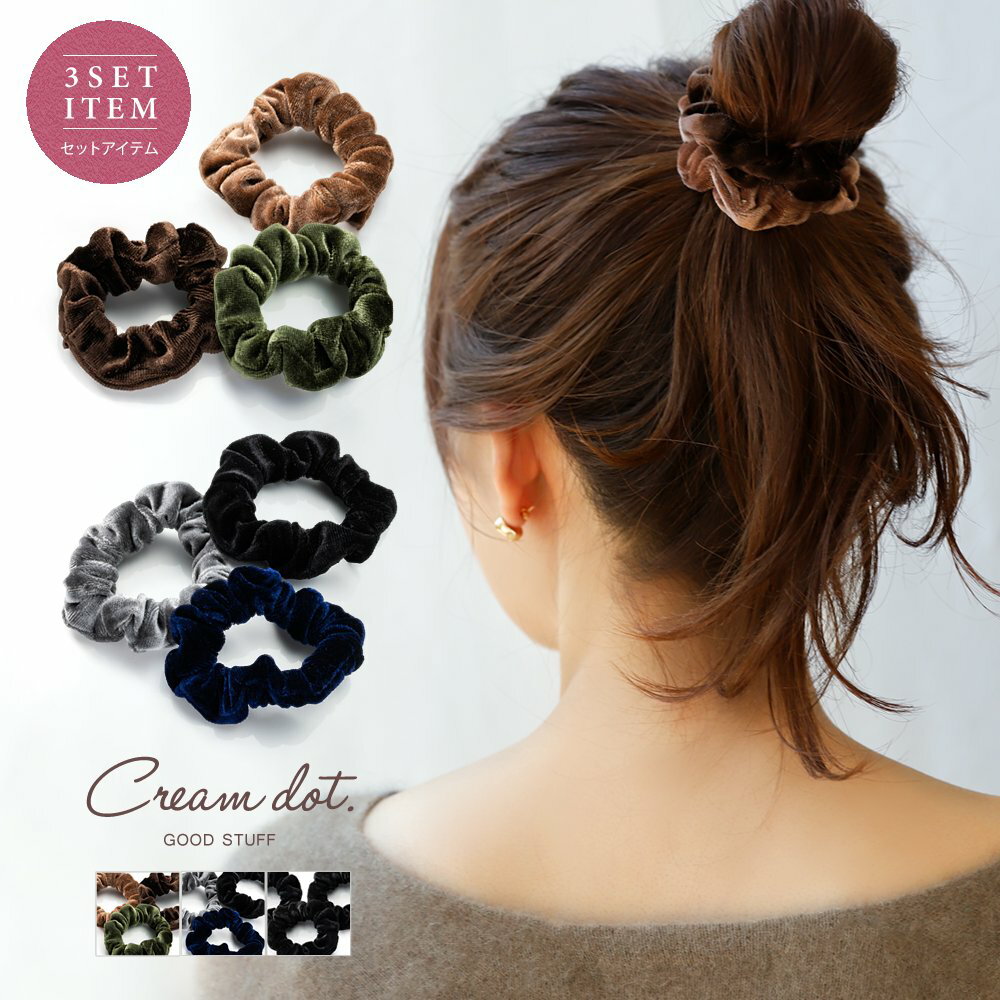 【一部予約:1月上旬】【全品送料無料×P最大47倍!】3点セット シュシュ ヘアゴム ヘアアクセサリー ベロア ベルベット ミニ 細め 光沢 髪留め まとめ髪 大人 軽い 跡がつきにくい ブラック グレー ネイビー カーキ ベージュ ブラウン