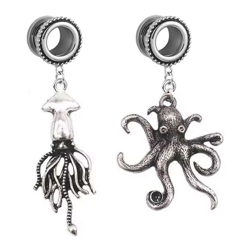 [2G 0G 00G 12mm ボディピアス] イカとタコトンネル /1ペア ボディーピアス 2ゲージ 0ゲージ 00ゲージ 12.0mm ステンレス シルバー メンズ レディース プラグ ホール 12ミリ プレゼント 揺れる ネジ式 烏賊 蛸 クラーケン 海賊 コスプレ おもしろい 面白い 寿司 すし 水族館