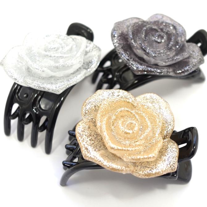 人気のディノバンスクリップの小さめタイプに飾り付! 卸価格でのご提供! 少し透明感のある大人っぽいきらきらの薔薇の花☆ お花は樹脂製で少々重さがあります。ラメは、ほとんど落ちないので、手や髪に付きません♪ 【色】 シルバーホワイト、ガンメタグレー、ゴールドベージュ ※ 土台のクリップはいずれも黒です。 【サイズ (約)】 土台のクリップ 8 x 3.4 cm お花パーツ 5.5 x 5 cm、全体の高さ 5 cm ※ メール便不可× ※ クリップには持ち手とお花の下辺りに1箇所ずつ穴が開けてあります。不良ではございません。