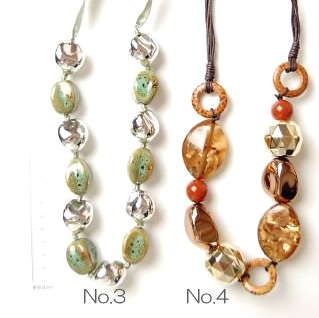 ギフト対応 今季トレンドを取り入れたファッショナブルなアクセサリー!落ち着いたオータムカラーを基調にしたネックレス、4スタイルのラインナップ!スネークチェーンやカラーセラミック、内部にクラッシュシェルをアレンジしたアクリルパーツなど、アーティスティックなパーツを豪快にあしらいました!☆個性的ながらスタイリッシュなコーディネートに☆カジュアルにもドレスアップにも、様々なシーンに合わせてお楽しみ頂けます♪バイヤーセレクトのハイファッションジュエリーをリーズナブルにご紹介♪ 他のデザインを見る! ■原産地:タイ ※手作りの製品のため表記のサイズには多少の誤差があります。 ※手作りの製品のためデザインが写真と多少異なる場合があります。 ※お使いのモニター、ブラウザにより色合いが実物と異なる場合がありますことをご理解の上お買い求め下さい。 写真からご希望のデザインNo.をお選びください。▼▼▼ 以下の写真からデザインNo.をお選びください ▼▼▼ 上の写真 デザインNo.1 サイズ:一周約56cm、重さ約95g素材:スエード、メタル 上の写真 デザインNo.2 サイズ:一周約52〜60cmで調節可、重さ約150g素材:メタル、アクリル 上の写真 デザインNo.3 サイズ:一周約50〜80cmで調節可、重さ約130g素材:セラミック、メタル、ポリエステルリボン 上の写真 デザインNo.4 サイズ:一周約60〜65cmで調節可、重さ約110g素材:シェル入りアクリル、セラミック、コットン、メタル、ウッド