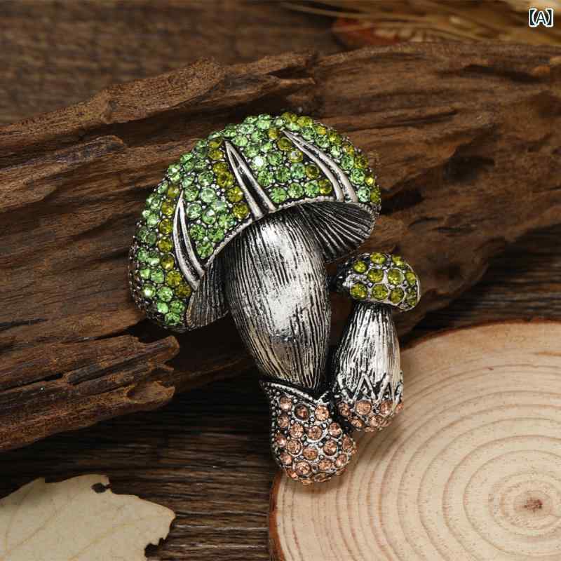 ブローチ 男女兼用 ユニセックス 植物 きのこ ラインストーン クリスタル ピンブローチ 胸元隠し 飾りピン トップス アウター 羽織物 おしゃれ ワンポイント 上品 合金 電気メッキ加工 レトロ カジュアルスタイル 普段使い 古銀 紫 緑