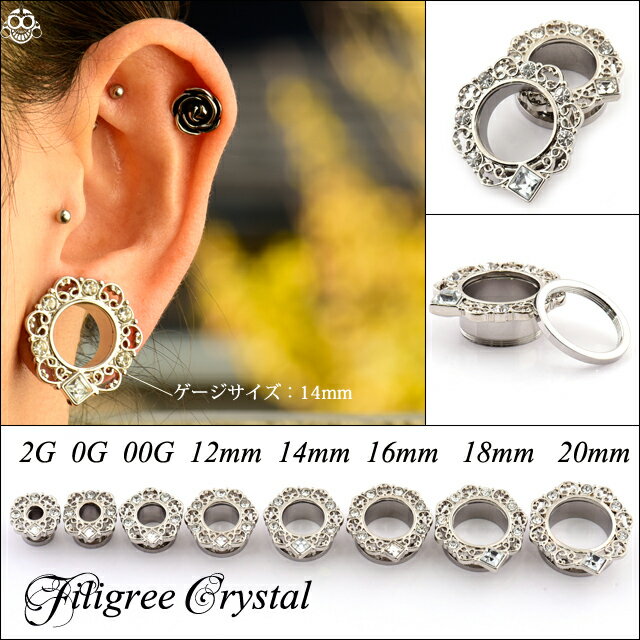 ボディピアス 18mm 20mm フィリグリー クリスタル フレッシュトンネル ロブ 拡張ピアス ステンレスピアス