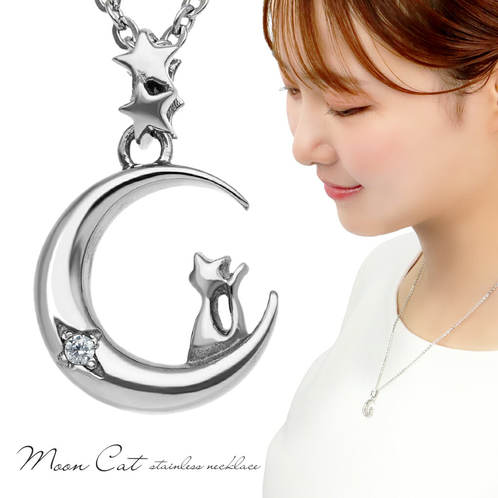 三日月 に佇む 猫 サージカルステンレス ネックレス ペンダント レディースネックレス 金属アレルギーフリー ステンレス ジルコニア ネコ 猫ネックレス 猫グッズ 猫好き 月ネックレス 星 かわいい 大人かわいい レディース 女性 彼女 娘 妻 クリスマス プレゼント 人気
