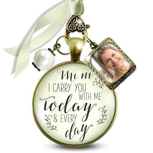 Gutsy Goodness Memory Wedding Bouquet Charm Mom I Carry You With Me Today Jewelry for Bride in Remembrance Vintage Bronze Cream Glass Pendant White Bead 1 Photo Frame Ties to F DIY Picture Template