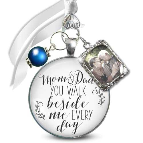Gutsy Goodness Memorial Wedding Bouquet Charm Mom and Dad You Walk Beside Me Every Day Honor Parents 1 Photo Frame Silvertone White Glass Pendant Something Blue Bead Bridal F Picture DIY Template