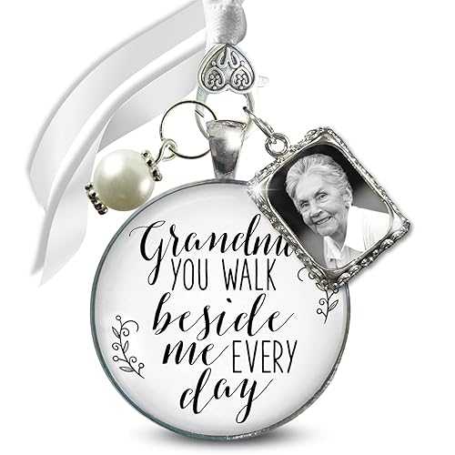 Gutsy Goodness Wedding Bouquet Charm Grandma You Walk Beside Me Every Day 1 Photo Frame Silver Memorial Keepsake Jewelry White Glass White Bead Bride's Memory of Grandmother DIY Picture Template