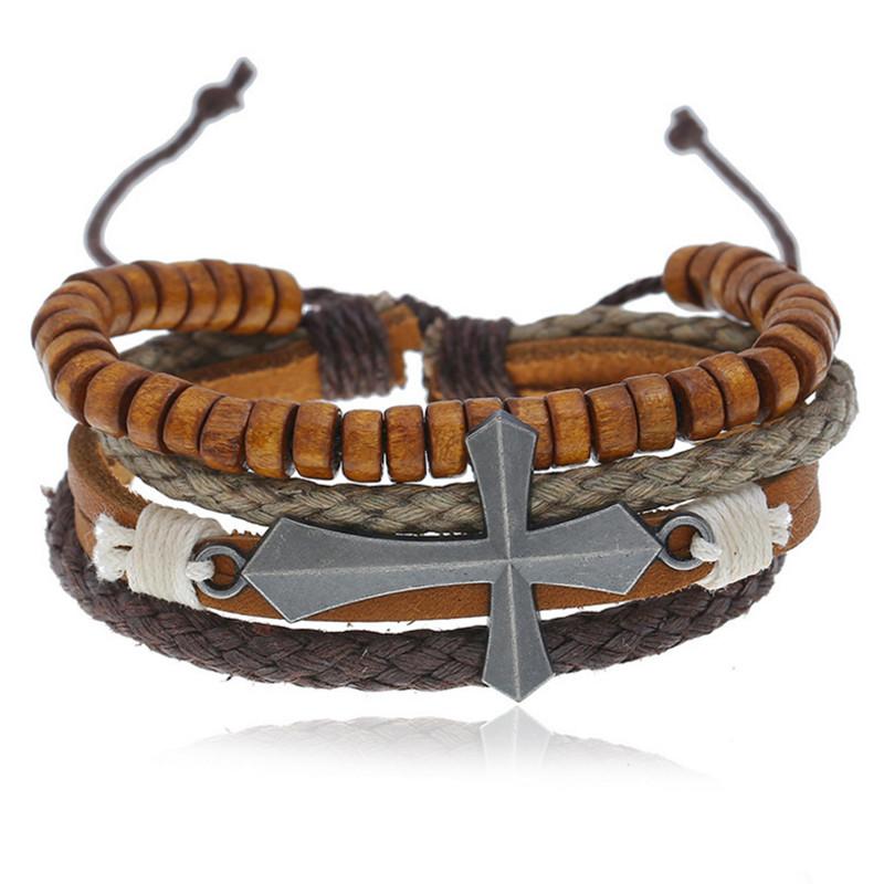 ブレスレット 男女兼用 欧米風 レトロ ヴィンテージ 本革 牛革 レザー 合金 クロス ウッドビーズ ビーズ 多層 重ね付け カジュアル 普段使い おしゃれ ブラウン 茶色系