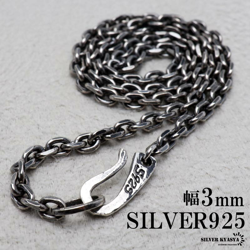 シルバー925 燻し仕上げ あずきチェーン ネックレス 幅3mm 4面カット ブラック 黒 ネックレスチェーン 重厚 フックタイプ シルバーネックレス メンズ 男性 金属アレルギー対応 父の日