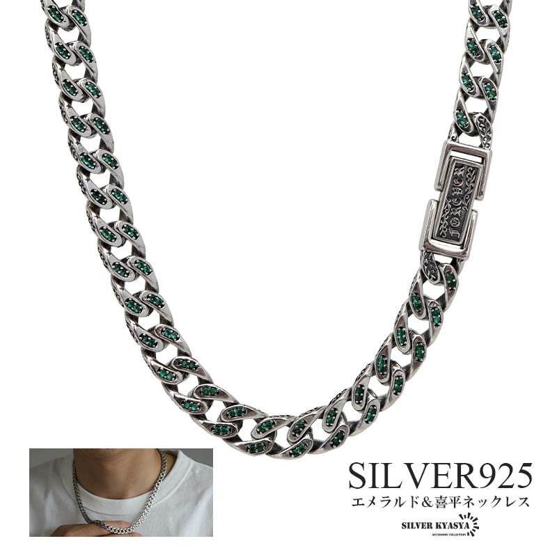 詳細 商品概要 ■エメラルド&喜平チェーン 定番の喜平チェーンの全体にエメラルドカラーのジルコニアをふんだんに取り入れた存在感溢れるデザインの個性的なアイテム。 ■SILVER925素材 シルバー925は、銀含有率(純度)92.5%を示し、一般的に純銀として扱われています。サビや劣化等がほとんどなく金属アレルギーも出にくいとされており、アクセサリーとして重宝される金属です。 素材 シルバー925(刻印あり) ジルコニア スペック 幅:約7mm 厚み:3mm 長さ:50cm 重量:約54g その他 ・SILVER KYASYA[シルバーキャシャ]オリジナルポーチ付属 ・関連アイテム 【キーワード】 メンズネックレス メンズジュエリー チェーン チェーンネックレス スタイル コーディネート コーデ ファッション カジュアル ストリート hiphop おしゃれ お洒落 こなれ感 シンプル プレーン 定番 人気 おすすめ 日常使い 普段使い レジャー テーマパーク 海 汗に強い 金属アレルギー 記念日 誕生日 お祝い 結婚式 入学 卒業 バレンタイン クリスマス プレゼント ギフト S925 silver925 SV925 AG925 メール便 ヤマト運輸 ラッピング対応 代引き対応 ギフト包装 送料無料 最短 即日発送