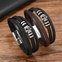 ブレスレット メンズ 装着しやすい マグネット式 多層 レザー 編み込み スカル ドクロ 亜鉛合金 ハンドメイド レトロ ヴィンテージ 黒 ダークブラウン