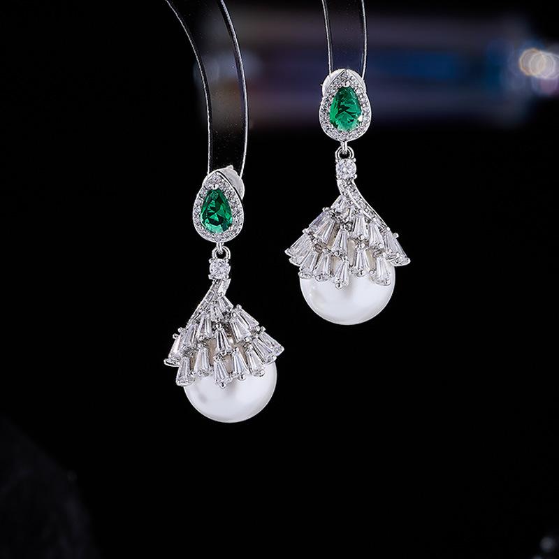 耳飾り レディース 女性用 フランス風 レトロ 宮廷風 S925シルバーポスト パール ジルコニア装飾 軽やか 上品 ファッション 高級感 通勤 電気メッキ加工 グリーン シルバー