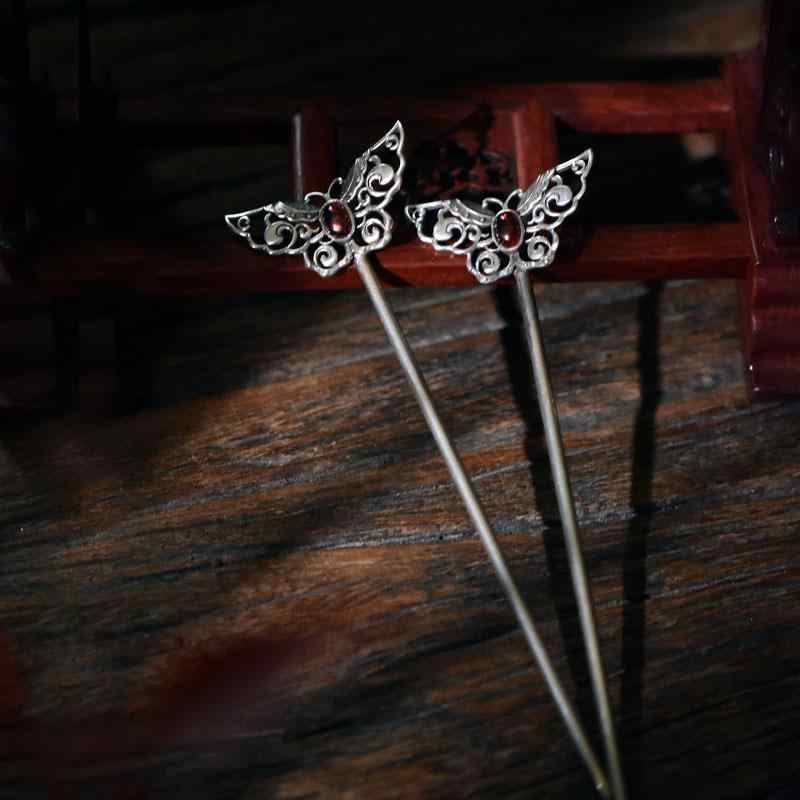 簪 レディース 女性用 シルバー製 宮廷風 吉祥模様 蝶デザイン ザクロ石埋め込み 揺れる飾り 漢服 和装 浴衣 髪飾り ヘアアクセサリー