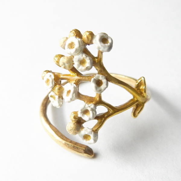 ブラフシューぺリアのアクセサリーは全ての女性をハッピーにさせる魅力があります。若きクリエーターたちは作品に対しての思い入れからひとつひとつに名前を付けています。また細部にまで神経をとがらせた結果、他にはないリアルな表現に優れて極めて上質な出来上がりになっています。全て日本製のお品です。清楚なカスミソウリング。華奢な枝は落ち着いたゴールドをベースにしているので、かすみそうの白い花が映えます。サイズはフリー、素材は真鍮です。メール便発送の場合には送料は無料です。
