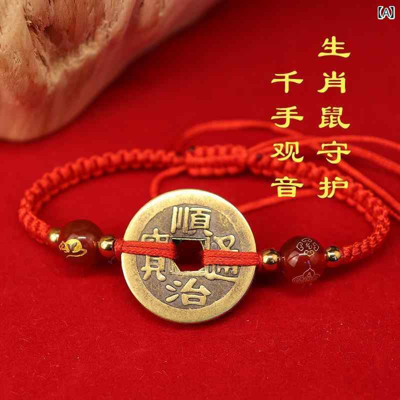 アンクレット メンズ 手編み 赤 縄 五 帝 コイン アンクレット 十二支 八大守護神 銅 ブレスレット 干支年 男女兼用