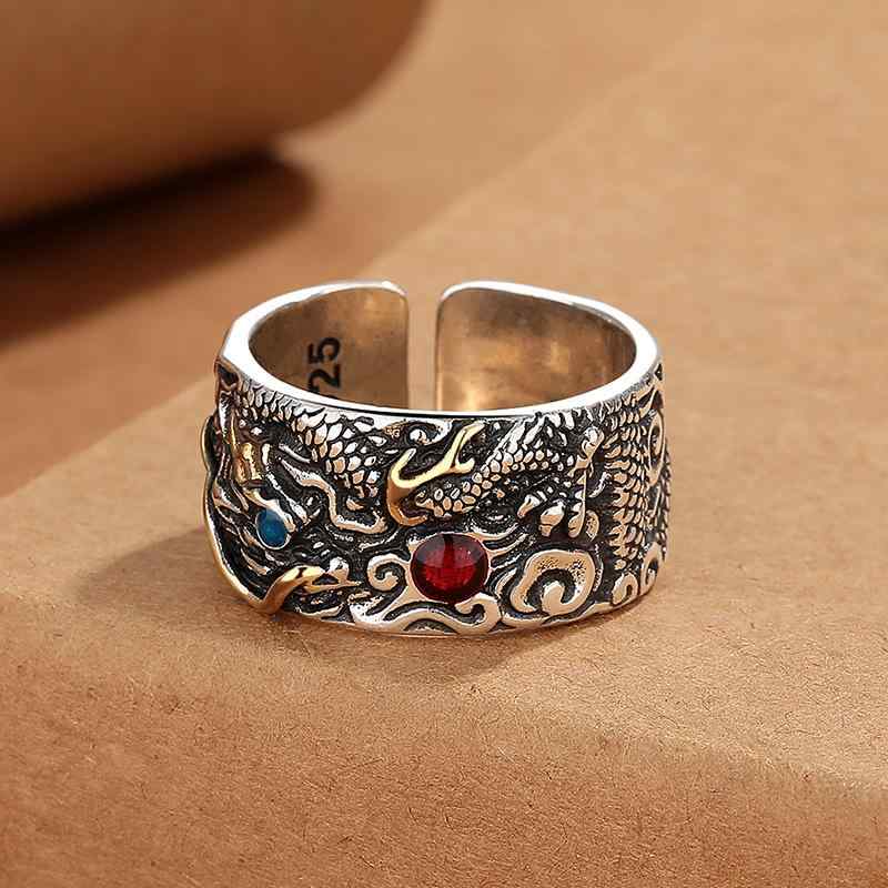 指輪 メンズ 存在感抜群 祥龍 宝珠モチーフ 干支 龍 銅製 レトロ ヴィンテージ 民族風 中華風 個性派デザイン 開口式 フリーサイズ
