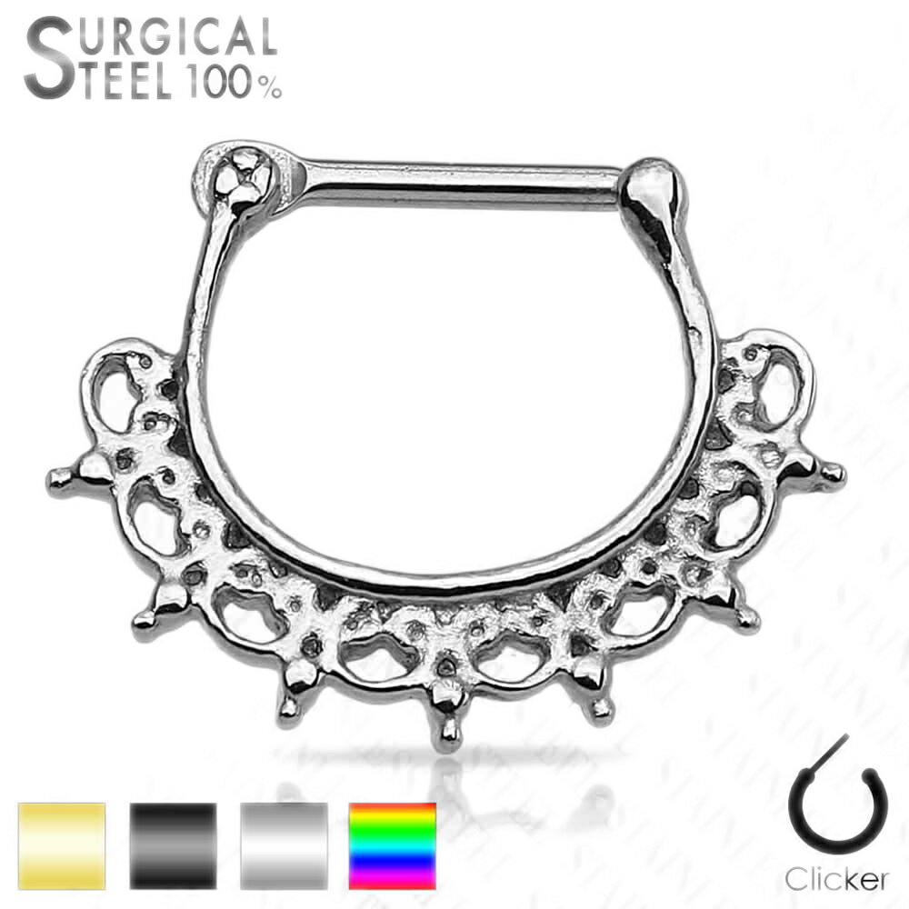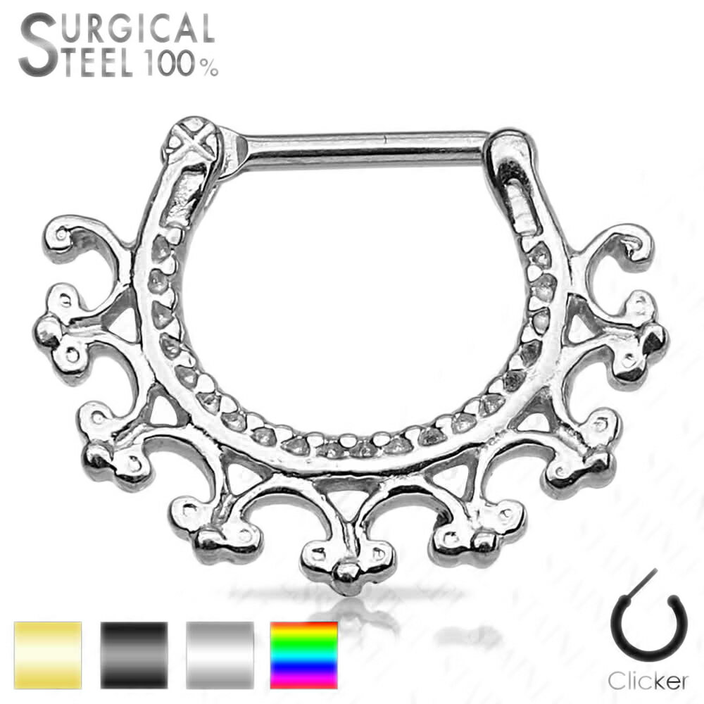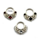 ジュエルをセットした高級感のあるサイド部分がカットされたボディピアス。セプタムクリッカーはワンタッチで開閉でき装着が簡単なので、鼻の真ん中の軟骨部分のピアスとして人気です。もちろんセプタム以外にヘリックスや耳たぶ、トラガス、ニップルなどに使ってもいい。ワンタッチピアスの感覚で装着できるので、ボディピアス初心者の人でも簡単に装着できる。ビーズリングが苦手な人にオススメ! スペック16ゲージ(1.2mm)内径:7mm素材メタル備考表示は1ヶの価格です。写真はイメージです。実際の商品とは多少異なる場合がございます。ハンドメイドの為多少サイズは異なります。