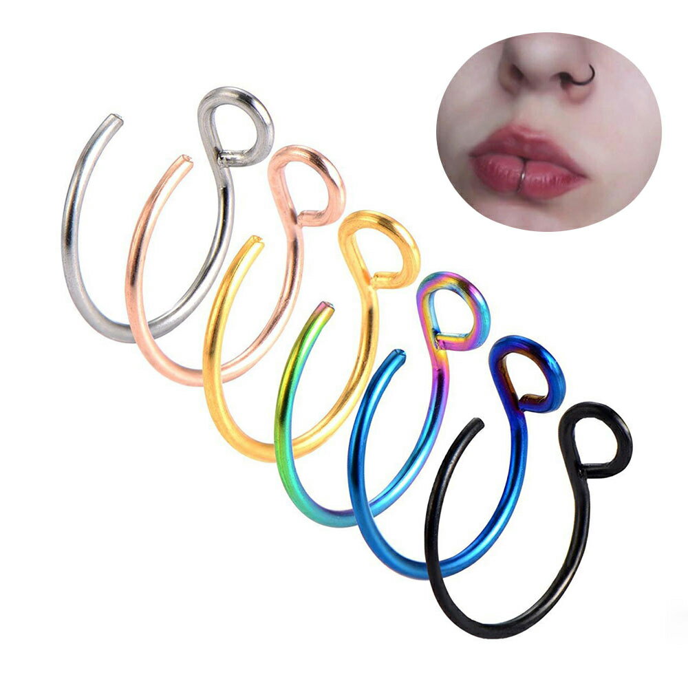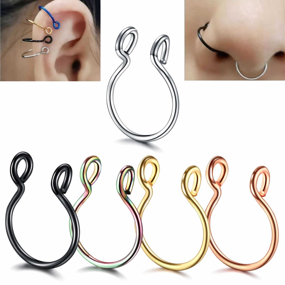 サージカルステンレス316L製のフェイクリングに無垢のステンレスカラーとピンクゴールドと金色イエローゴールド、虹色レインボー、黒色ブラックにメッキした5色から選べる穴を開けない鼻の穴の間にある軟骨セプタムにするノンホールのボディピアス。ピアスを開けていなくても、イヤーカフやイヤリングのようにはさむだけで簡単に装着できるので大人から子供まで幅広い層が楽しめるボディーピアスです。カラーも選べるのでメンズでもレディースでも使える。シンプルなのでどんなスタイルのファッションにも似合う。鼻の軟骨だけでなく耳たぶや耳の軟骨、ニップルピアスのノーホールピアスとしても使えそう。[スペック]シャフトの太さ:20ゲージ(0.8mm)内径:8mm / 10mm[素材]サージカルステンレス316L[備考]・表示は1ヶの価格です。写真はイメージです。実際の商品とは多少異なる場合がございます。ハンドメイドの為多少サイズは異なります。