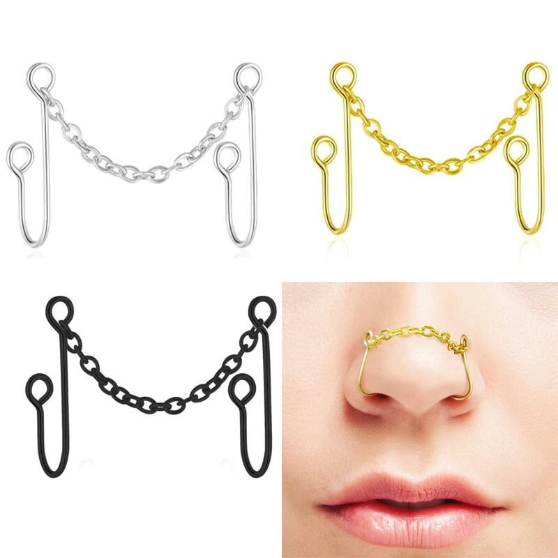 [鼻用] ステンレス製 ダブルチェーンノーズクリップ 1個 フェイク ボディピアス ボディーピアス イヤーカフ イヤリング シルバー 銀色 金色 ゴールド 黒色 ブラック フェイクピアス メンズ レディース はさむ ノーズカフ 2か所 2個 つなぐ 鎖 くさり クサリ 2連 流行 お洒落
