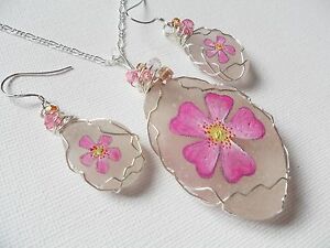 【送料無料】ジュエリー・アクセサリー ガラスネックレスイヤリングダングルセットピンクドッグローズpink dog rose dipinte a mano su ordinazione mare vetro collana e orecchini dangle set