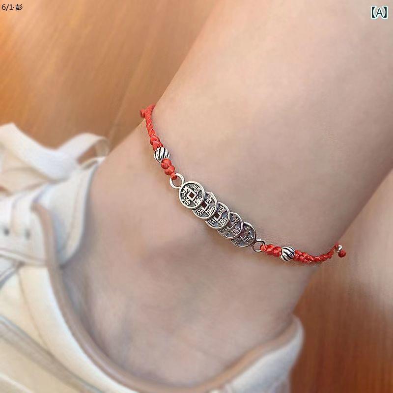 アンクレット アクセサリー メンズ 五 帝 コイン アンクレット 男女兼用 黒と 赤の ロープ カップル シンプル 手編み レトロ ホット スタイル