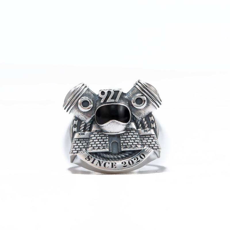 リング メンズ レディース 男女兼用 指輪 ピストンモチーフ ブラックエナメル アンティーク加工 ヴィンテージ シルバーカラー オープンリング フリーサイズ サイズ調節可能 個性的 ファッションアクセサリー ストリート カジュアル 普段使い 真鍮製