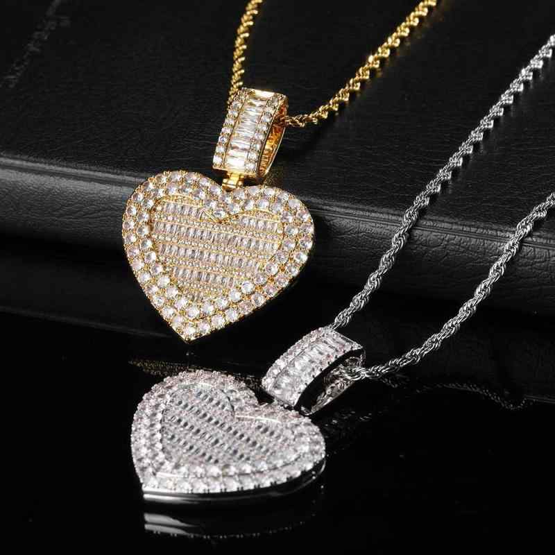 ネックレス メンズ 男性用 ヒップホップ 風 ハート型 フォトフレーム ペンダント ジルコニア 真鍮製 ラッキーアイテム アクセサリー ゴールド 白金