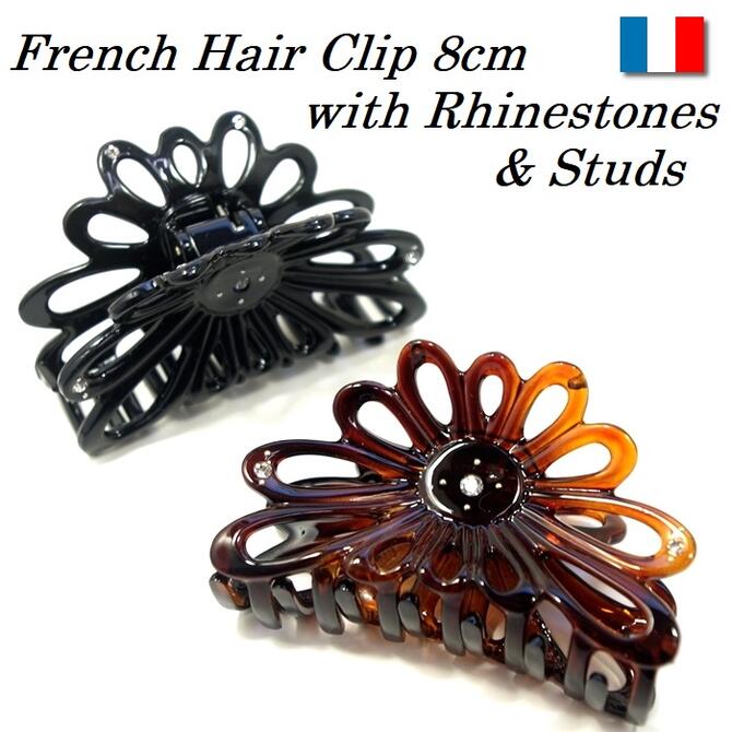 フランス製。透かし模様がきれいなお花型ですが、甘すぎないスタイリッシュなデザイン。 バネを隠す構造で、上から見てもすっきり! 高級感が増します。 材質は軽くて丈夫なアセテートセルロース樹脂(アセチ)。なめらかな手触り。 エレガントな高級スワロフスキーラインストーン☆ お花の真ん中および花びらの先端に石と十字型にスタッズ。 上にもキラリと石が光ります。 中サイズですが、髪をたくさんはさめる形。ミディアム〜ロングの方に♪ 髪の量によってはロングのまとめ髪でもOK!しっかり留まります。 【色】 ブラック、べっ甲 【サイズ (約)】 8 x 4.5 x 4.5 cm ※ メール便不可× ※ 石やスタッズの配置が少しずれている場合があります。フランス職人のハンドメイドです。何卒ご容赦ください。 。*・。*・。*・ 石無しはコチラ 。*・。*・。*・ 。*・。*・。*・ 石付き類似品はコチラ 。*・。*・。*・ 。*・。*・。*・。*・。*・。*・。*・。*・。*・。*・。*・