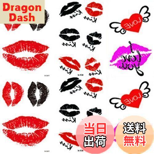【送料無料】Yesallwas タトゥーシール 口紅 6枚セット 赤 紫 kiss ハート 唇 キス タトゥーステッカー ボディーシール 刺青シール 防水 レディース Sexy lipstick tattoo (黒 赤)