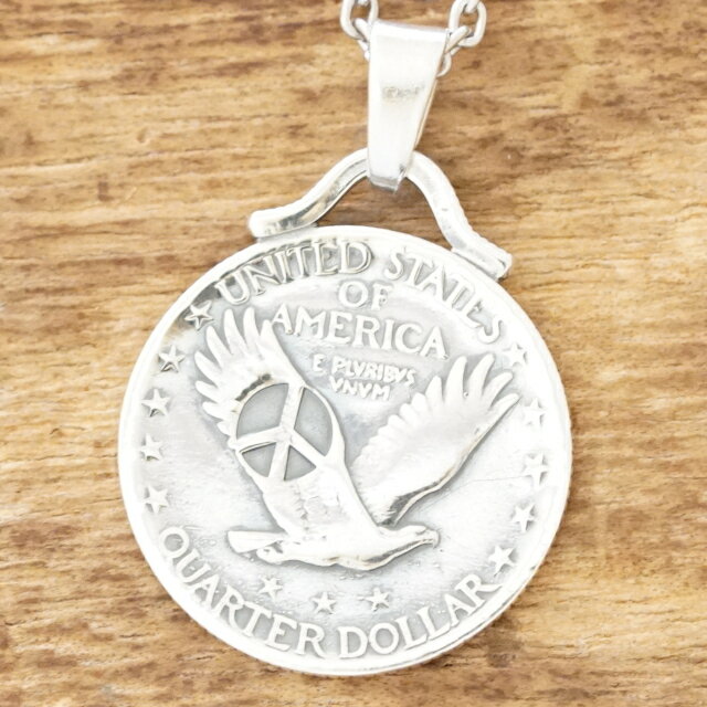【ノースワークス】 創業者の橋本毅はアメリカ西海岸カルチャーに心底傾倒し、インディアンジュエリーや60〜70年代ヒッピーのコインワークに魅せられ、独学で技術を極めた。 1992年より神奈川県横浜市においてオーダーメイドジュエリーとインディアンクラフトを中心としたアトリエ、兼カフェをオープン。2006年、在日米軍基地がある東京都福生市に拠点を移したのを機に同じような世界観を持つ仲間が集まり、レザークラフトやビーズワーク等のアイテムを展開する。 橋本が持っていた技術と意志を受け継ぎ、素材の美しさ、ベーシックなデザインを基本として変わらない価値を持つモノを作り続ける。 1点ずつ手作業で作り上げていく為、それぞれ顔があり、作り手のぬくもりと何年経っても褪せることのない素材を感じてもらえるものである。 ヴィンテージの25セント銀貨にピースマークをスタンプしたネックレス。 コインデザインをそのまま残しつつアレンジを加えたシンプルで飽きのこないアイテムです。 歴史あるコインにさりげなく打ちこまれたピースマークスタンプがスタイリッシュな胸元を演出してくれます。 カジュアルからフォーマルまで様々なスタイルに合わせやすく、使い込む程に味わい深く変化します。 燻しが施されたシルバー925製の丸アズキチェーンは、3サイズ(40cm/45cm/50cm)から長さをお選びいただけます。[ご注意]40cmと45cmは50cmをカットしてサイズ調整しますので、片側のプレートはつかず、写真とは異なります。カット後の交換はできません。[一般的な着用サイズ]40cm:女性 首元45cm:男性 首元 / 女性 胸元50cm:男性 胸元 / 女性 ロングチェーン 【商品詳細】 [素材] シルバー900,シルバー925 [付属品] ポーチ [トップ] 縦幅 32mm(バチカン含む) 横幅 24.5mm 厚み 1.5mm [チェーン] 全長 50cm(40cm/45cm/50cmの3サイズからお選びいただけます)[ご注意]40cmと45cmは50cmをカットしてサイズ調整しますので、片側のプレートはつかず、写真とは異なります。カット後の交換はできません。 幅 2mm ◆製品に関しまして◆ ヴィンテージのコインを使用しておりますため、コイン1つ1つに個体差があり、刻印具合・燻し具合・輝き・柄・風合いが異なり、凹凸などが生じますが、ヴィンテージ品の持つ魅力の一つでもあり、不良品ではございませんので、予めご了承の程、宜しくお願い申し上げます。 ※お支払い方法に関しまして※※予約商品に関しまして、代金引換でご注文のお客様のキャンセルが多いため、誠に申し訳ございませんが、代金引換でのお支払いはお受けできません。ご理解・ご了承の程宜しくお願い申し上げます。※セブンイレブン・ローソン前払い、銀行振込はご注文日から14日以内にご入金をお願いいたします。入金の確認ができましたらメーカーにオーダーいたします。NORTH WORKS(ノースワークス)正規販売代理店 フライング ピース イーグル コイン ネックレス